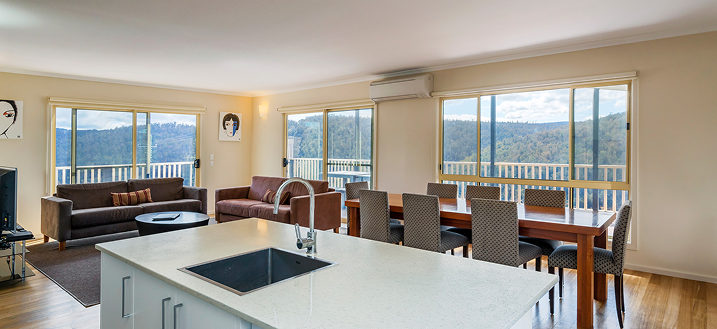 Perched on the edge of the escarpment with views of the Nive Valley and stretching back to Hobart this house is very modern in design while retaining highland warmth. A great house for a family get together, you can enjoy the social aspect of the open plan living spaces or escape to the balcony and simply enjoy the view.